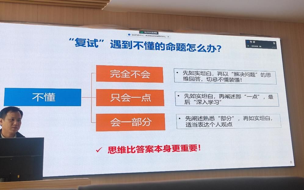 分享会上,赖云峰老师以他丰富的学术经历为蓝本,为同学们详细解读了本科、硕士、博士三阶段对考生论文能力的不同要求。他强调,随着学历层次的提升,论文的学术性、创新性和实用性要求也在不断提高。因此,同学们在备考过程中,不仅要注重基础知识的积累,更要注重培养自己的科研思维和实践能力。谈及考研复试的关注点,他指出本科成绩、科研经历、社团活动、社会实践以及个人荣誉都是考官们重点考察的内容,建议同学们在备考过程中做好充分准备,尽可能多地了解相关知识和信息,全面梳理自己的学习和实践经历,突出自己的优势和特长。同时,也要注意弥补自己的不足,复试中遇到的不懂的问题时,要保持冷静,坦诚地表达自己对这一领域的不熟悉,并尝试从已掌握的知识中给出相关的回答或提出自己的见解,明白思维比答案本身更重要。