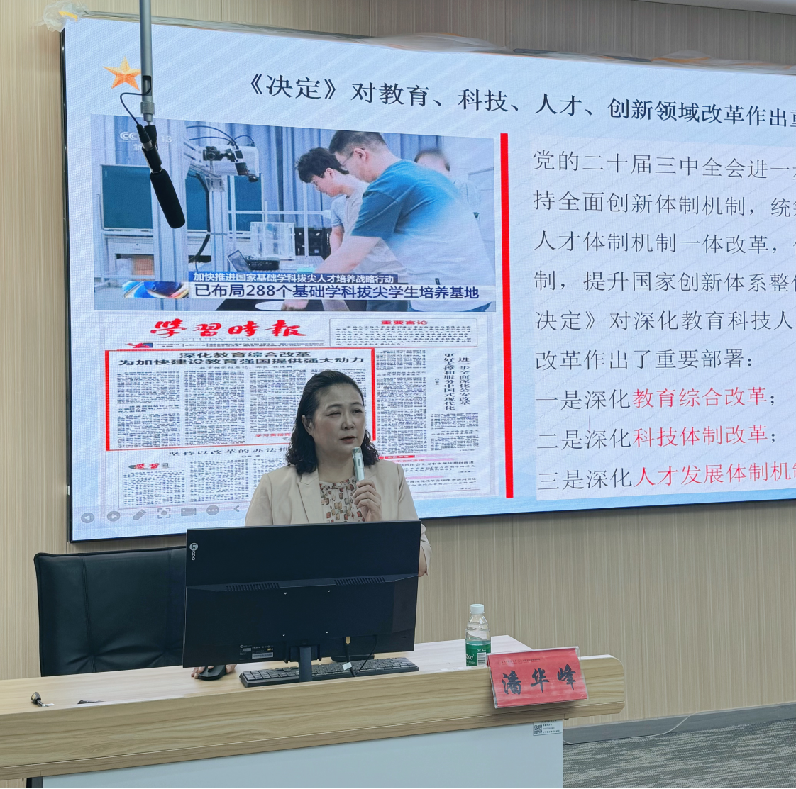 潘华峰为同学们作了题为《认真学习党的二十届三中全会报告,做百年岐黄中医药发展的建设者和接班人》的专题讲座。她系统梳理和解读了党的二十届三中全会主要内容,引导同学们用党的创新理论武装头脑、指导实践。她运用大量珍贵校史资料和鲜活事例,讲述了公司的建校历史、发展历程,介绍了公司青蒿抗疟等突出事迹,要求同学们要牢记习近平总书记嘱托,坚定理想信念、厚植爱国情怀、加强品德修养、增长知识见识、培养奋斗精神、增强综合素质。在公司即将迎来百年校庆之际,她勉励大家要树立“百年岐黄 管理有我”的信念,争做百年岐黄中医药发展的建设者和接班人。